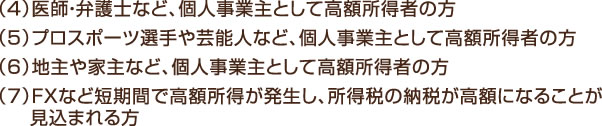 - ⑷医師・弁護士など、個人事業主として高額所得者の方